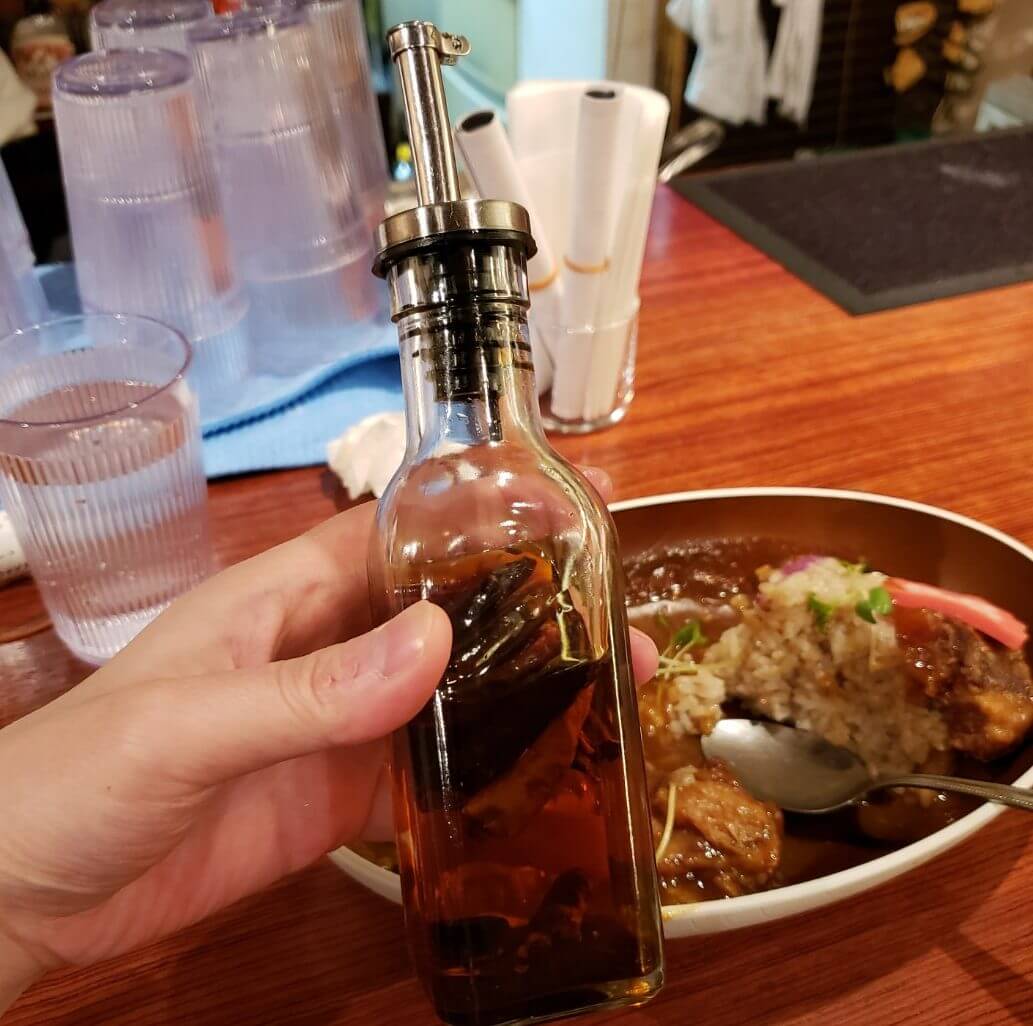 卓上にあった唐辛子オイルを入れて、お好みの辛さに調整できるようです。