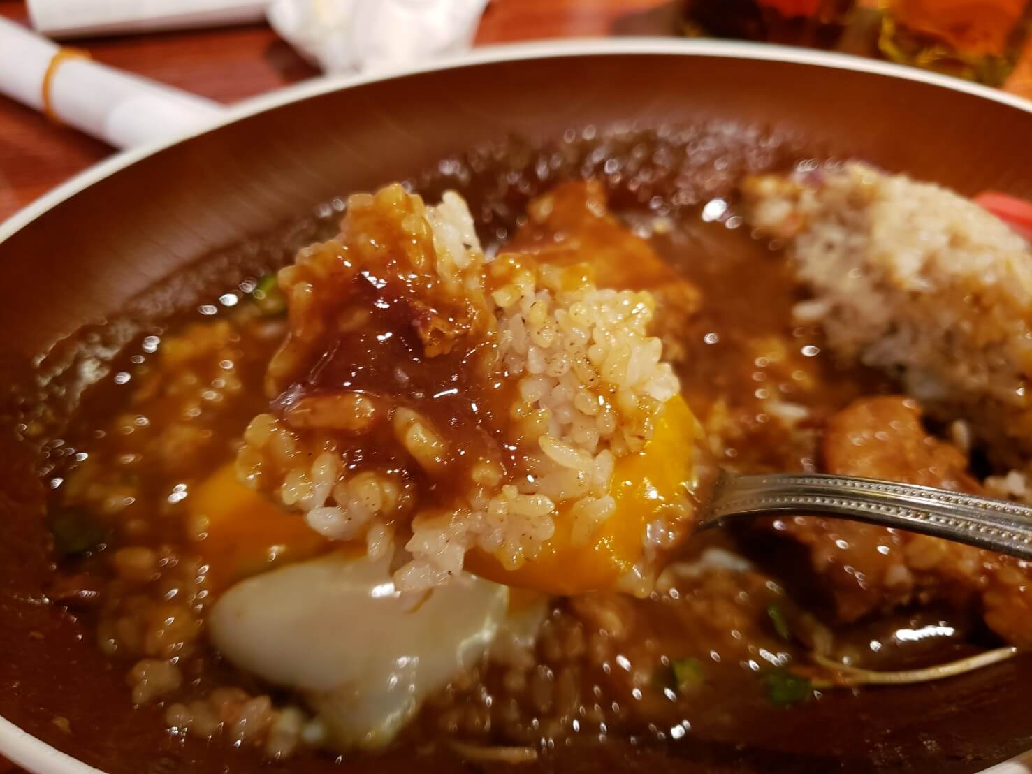 卵とカレーを混ぜることで、辛さが控えめになりまろやかになる。