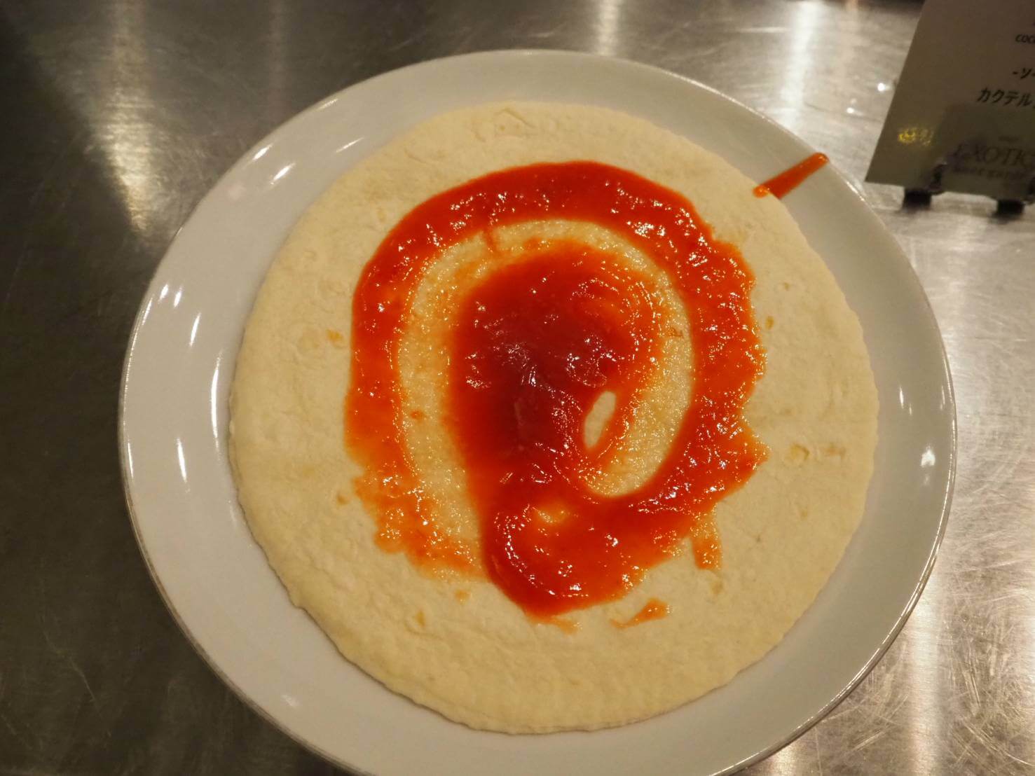①タコスっぽい生地にタコソースを塗ります。