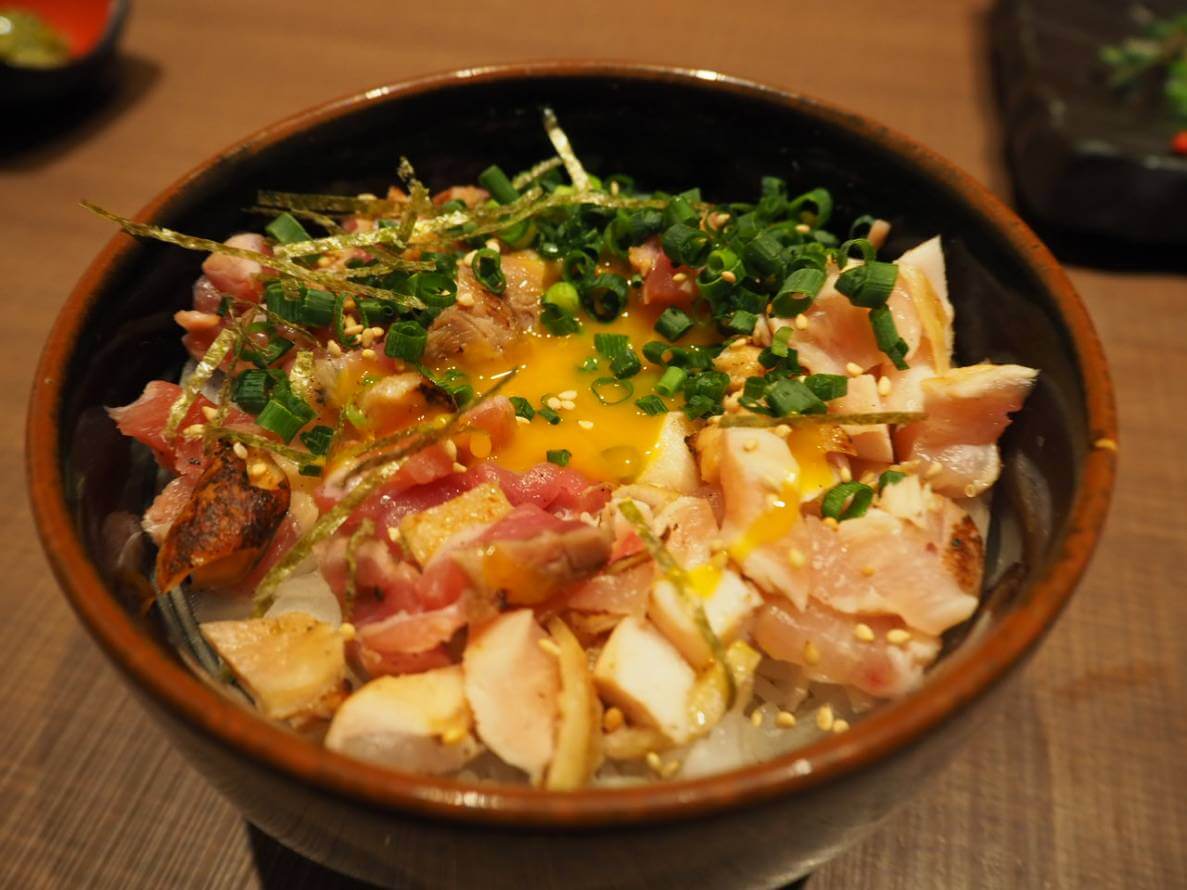 軽く炙った鶏肉(もも肉、胸肉等)がご飯の上に敷き詰められています。