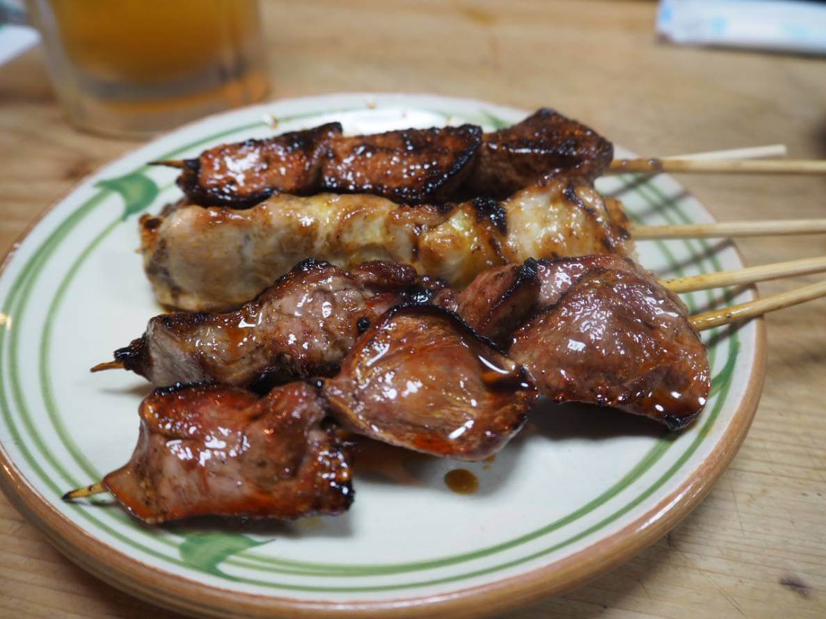 カウンターの端っこに山盛りの焼き鳥が置かれています。
