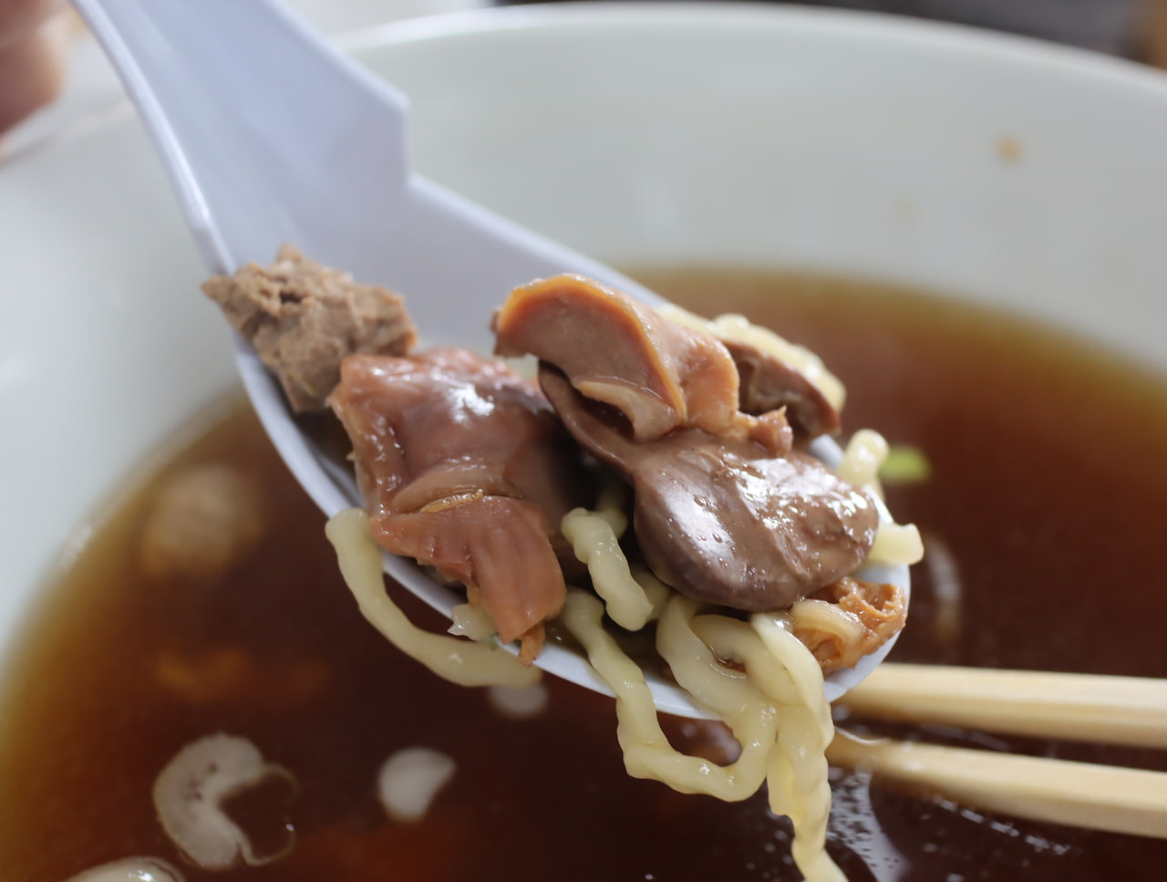 ラーメンを食べ尽くして、スープをすすっていると底の方からゴロゴロとモツが10個くらいでてくる。