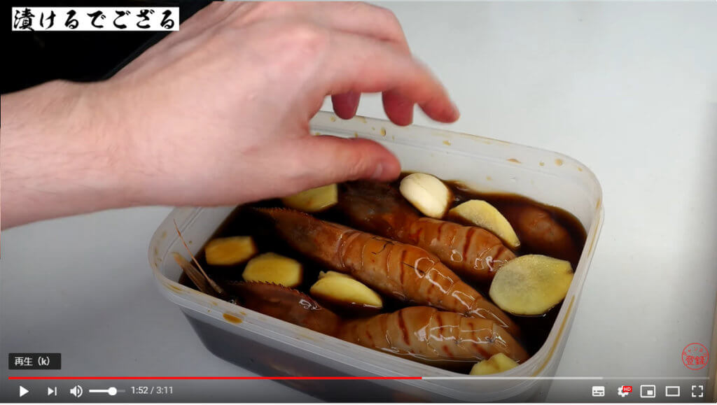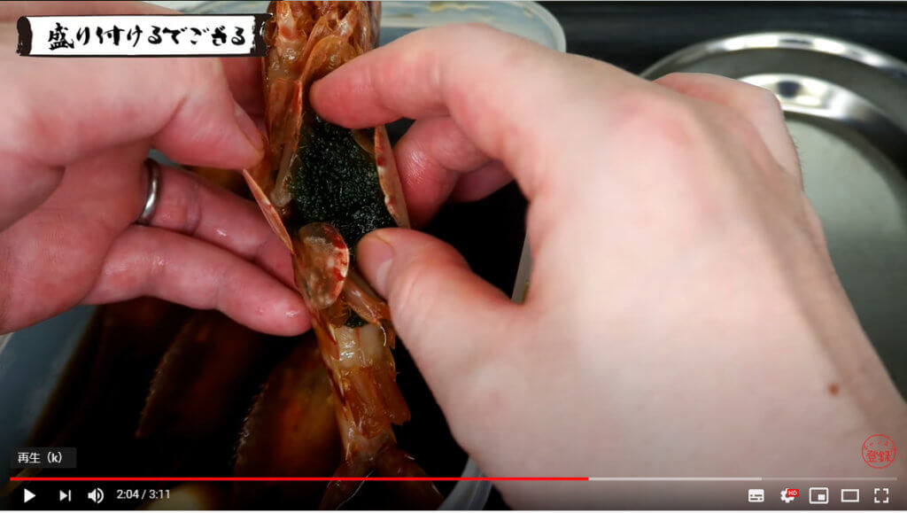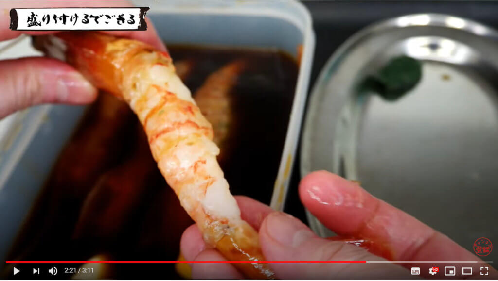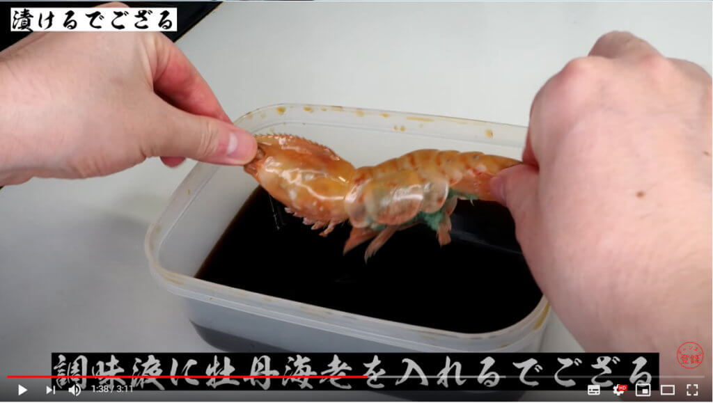 タッパーの調味液に牡丹海老をダイブさせます。