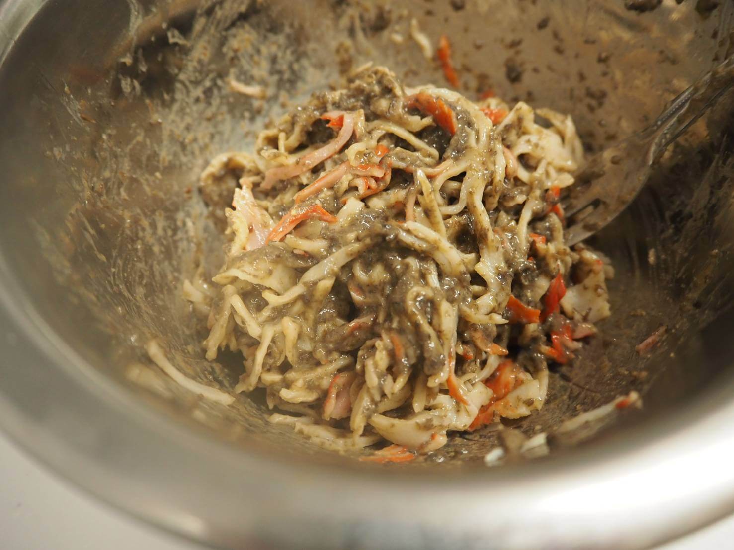 ①かに風味サラダを画像の様に裂いてください。