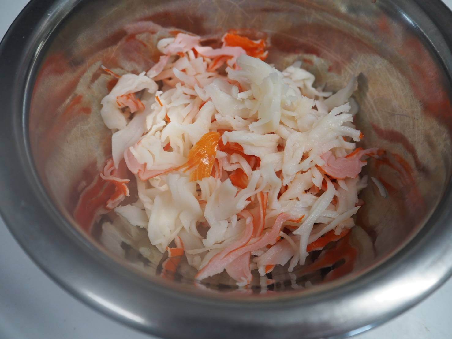 本物の蟹は、買えないので「かに風味サラダ」を使用します。笑