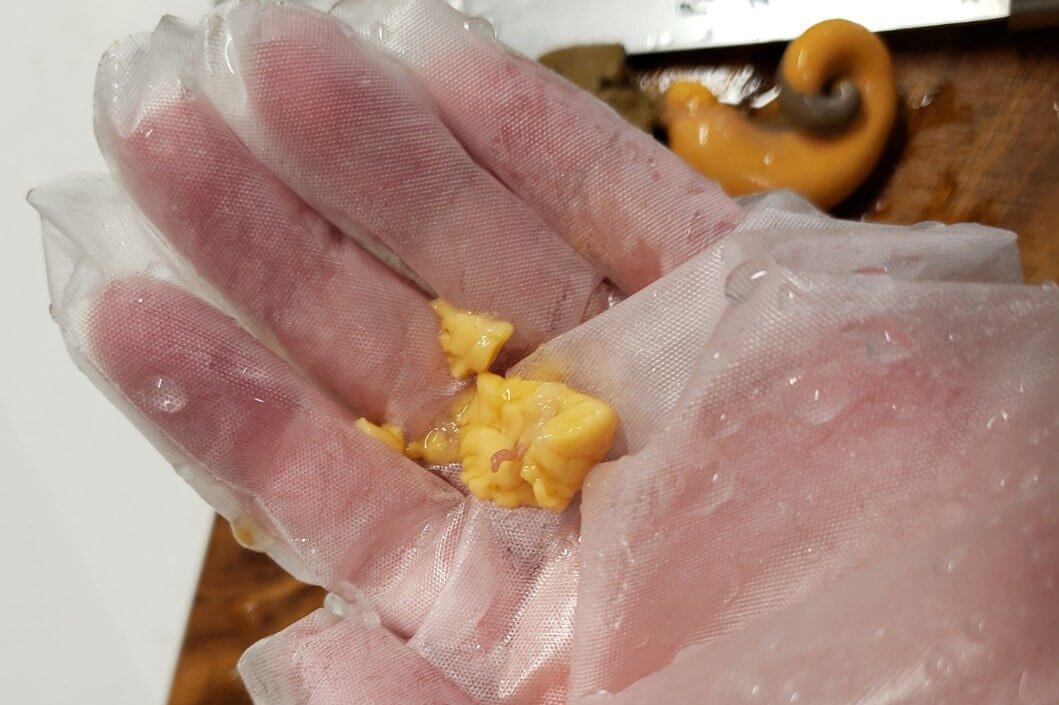 つぶ貝の両側に唾液腺(通称(脂))と呼ばれるバター上の脂のようなものが出てきます。