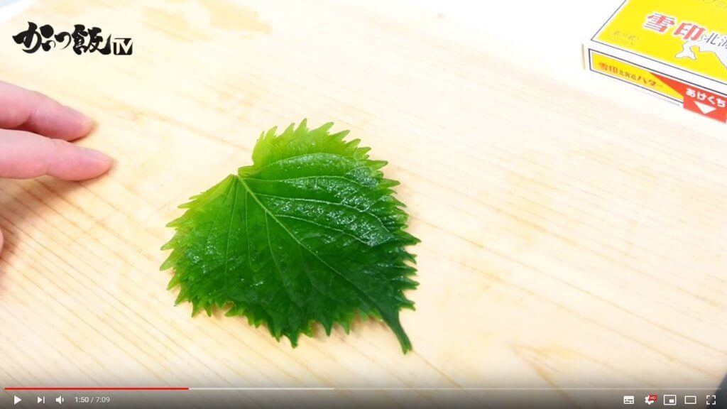 バターがご飯に馴染んだらその上に、刻み海苔と大葉、いりごまをトッピングします。