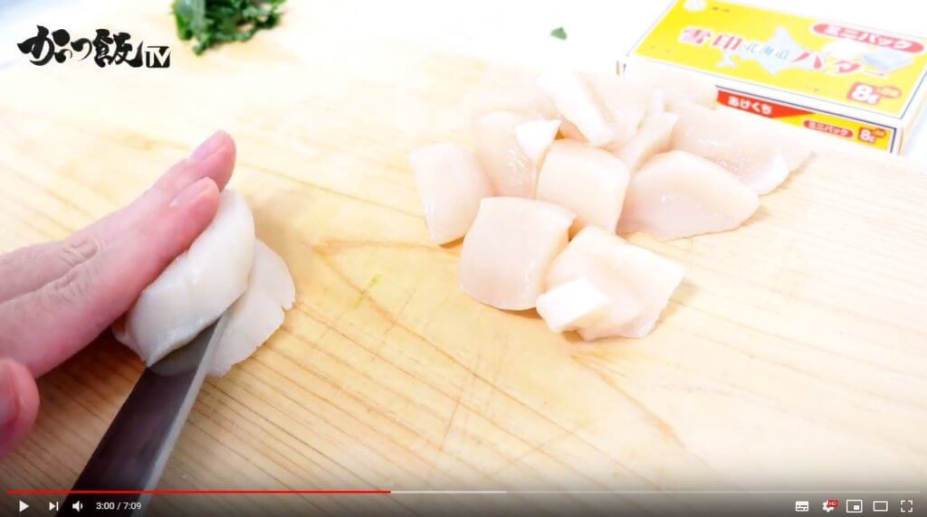 今回は大きいホタテが1つあって、それを映え要素として活かしたいので最後まで切らずに魚の開きのようにカットしました!