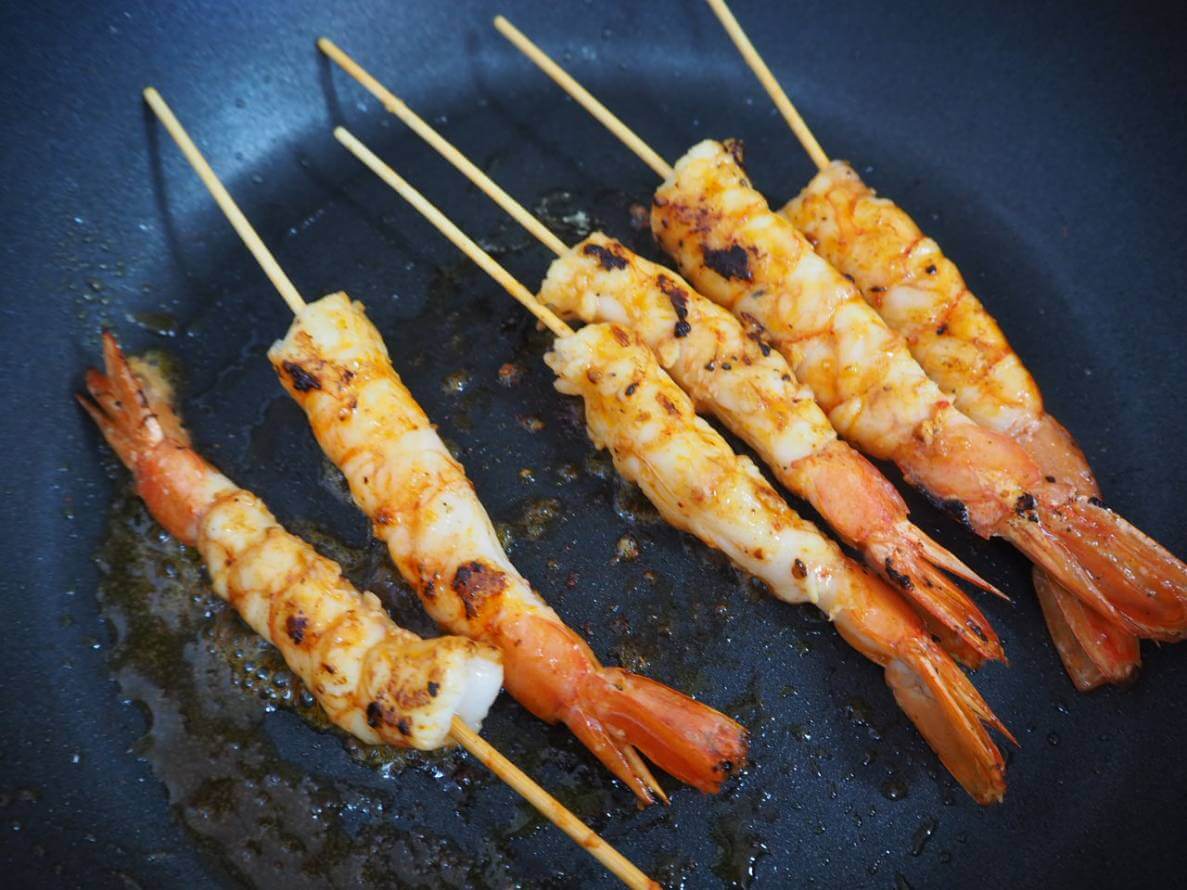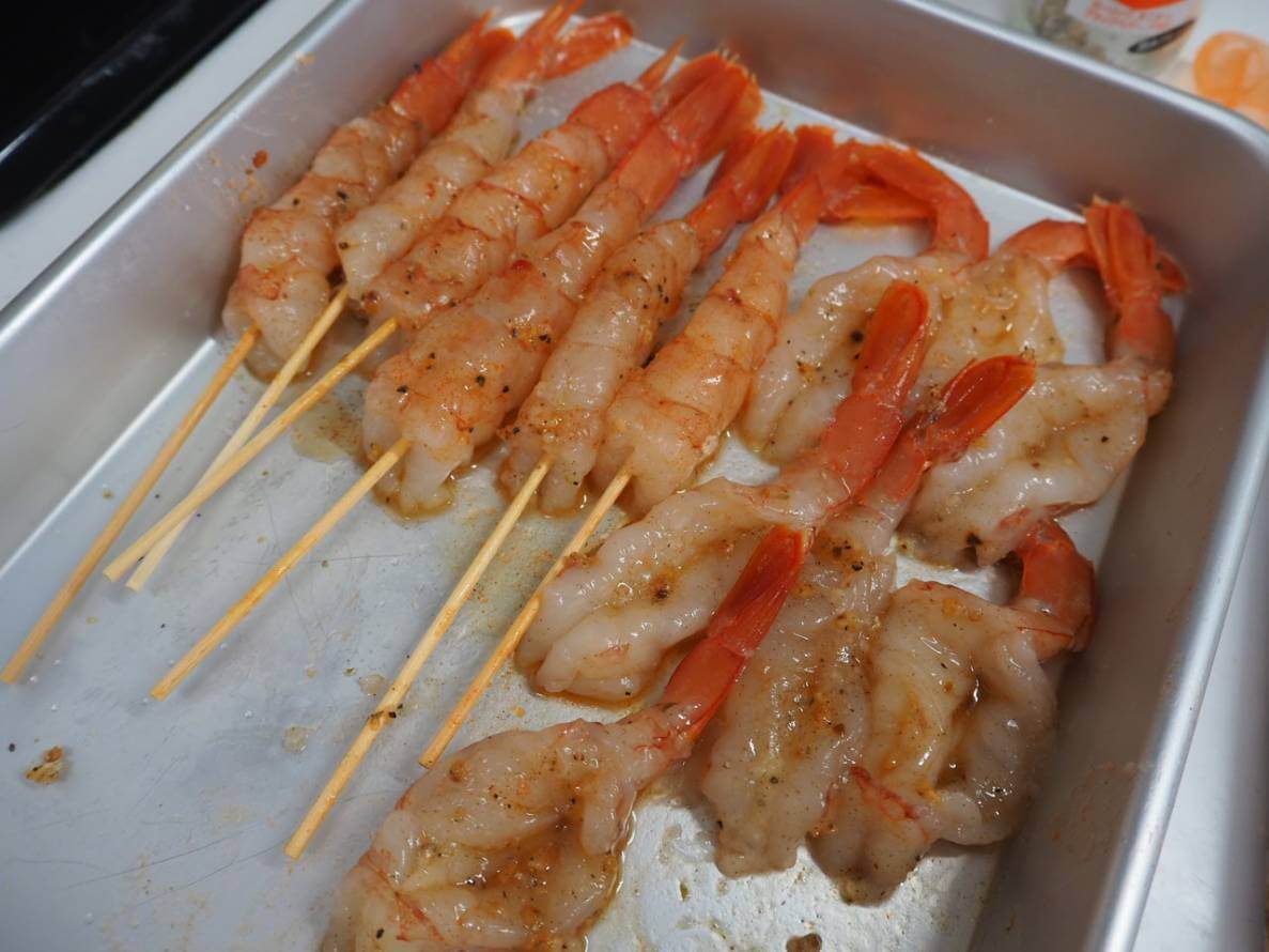 焼いたときに海老が曲がらないように竹串をぶっ刺します。