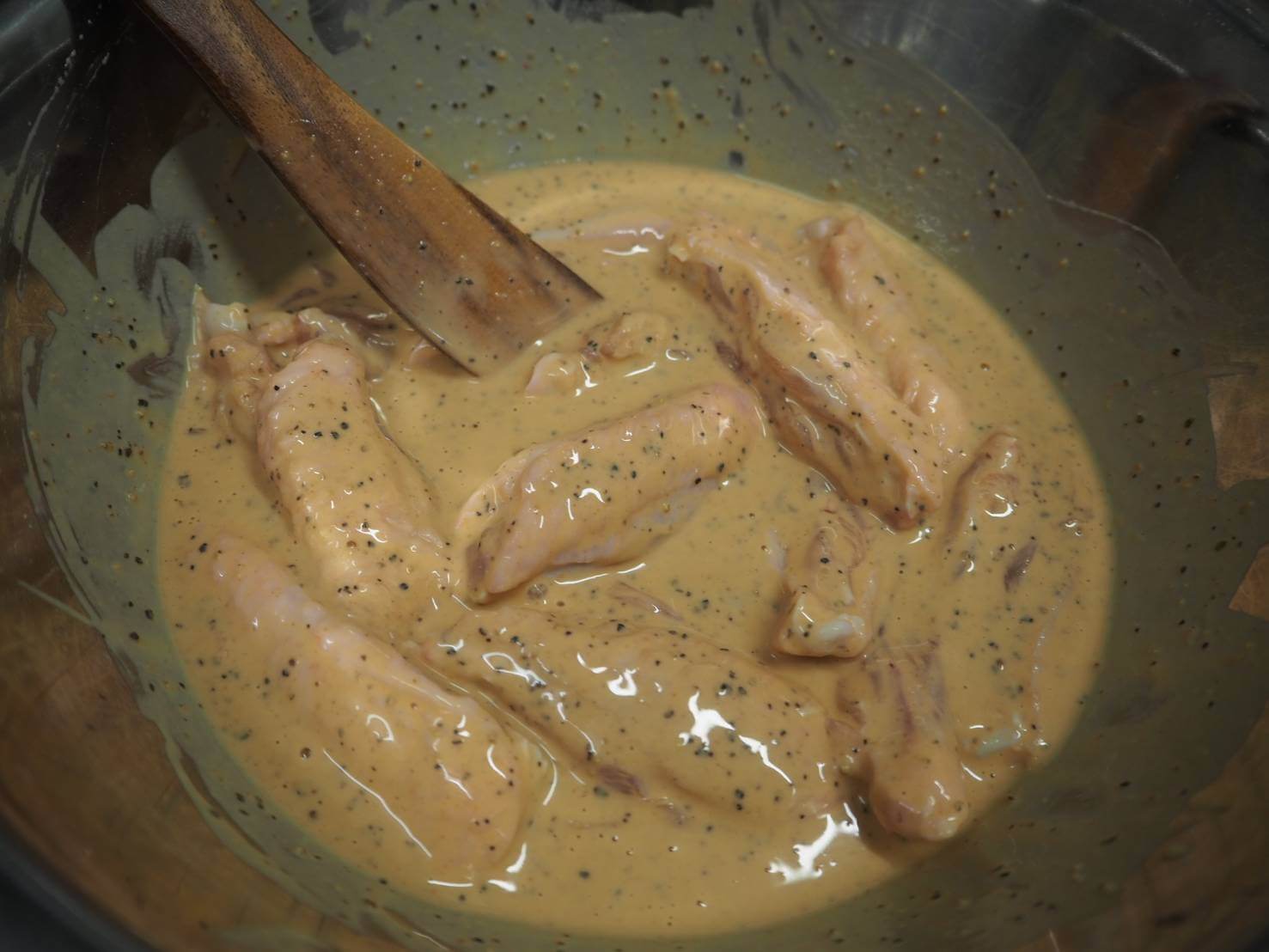 ②手羽中を加え、からめてから、なじむまで5分~10分間おきます。