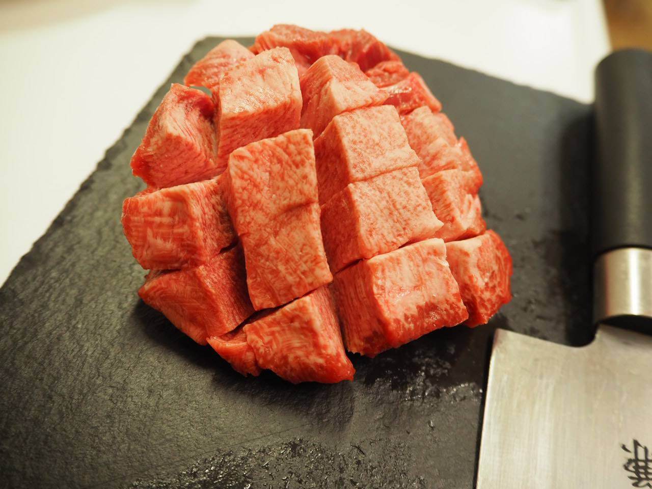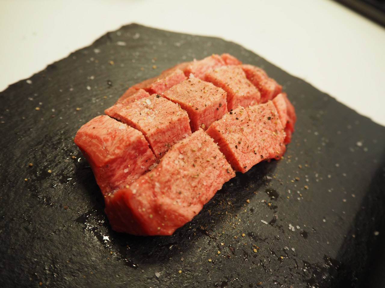 牛タンをサイの目に切れ目を入れます。