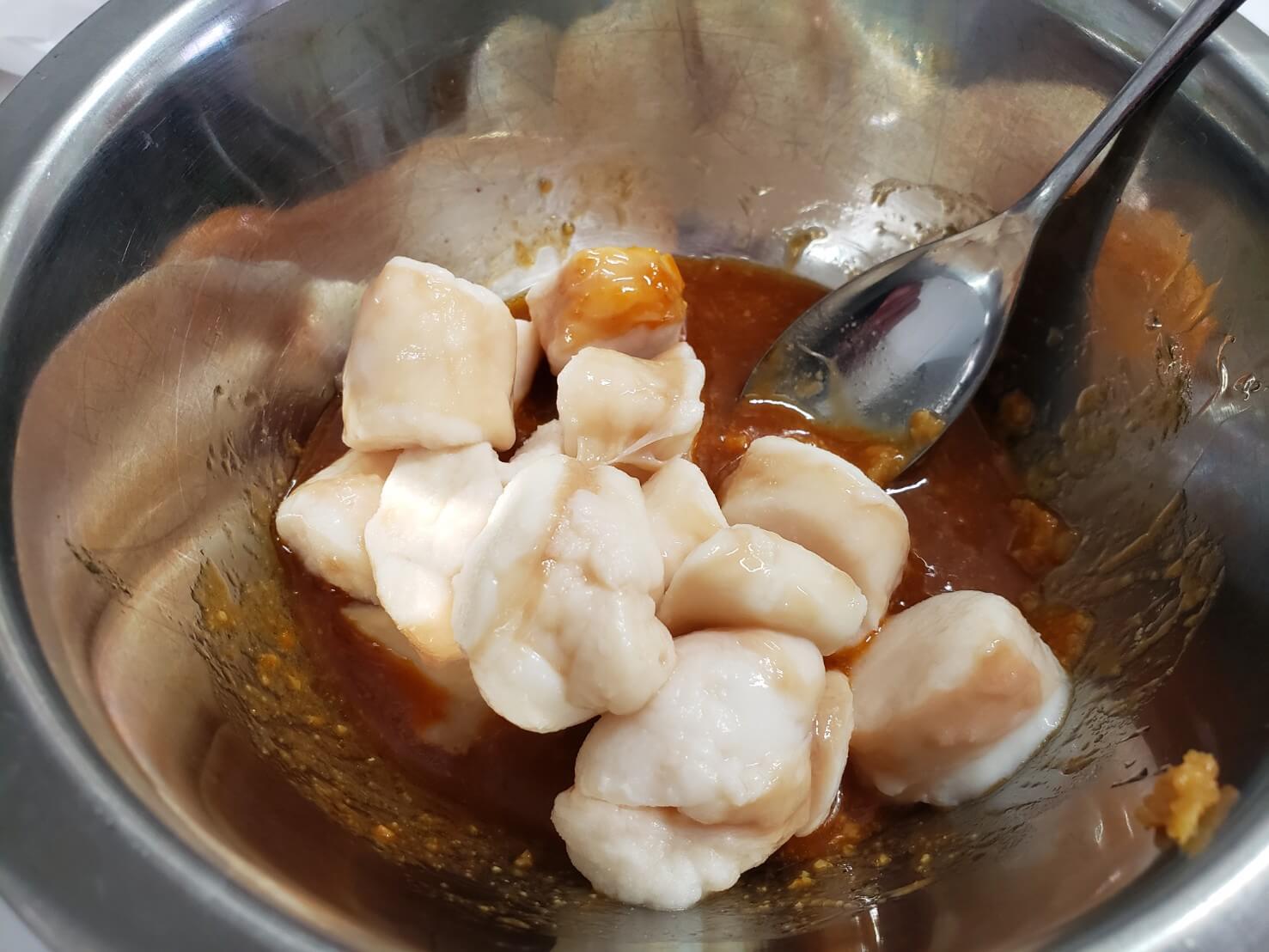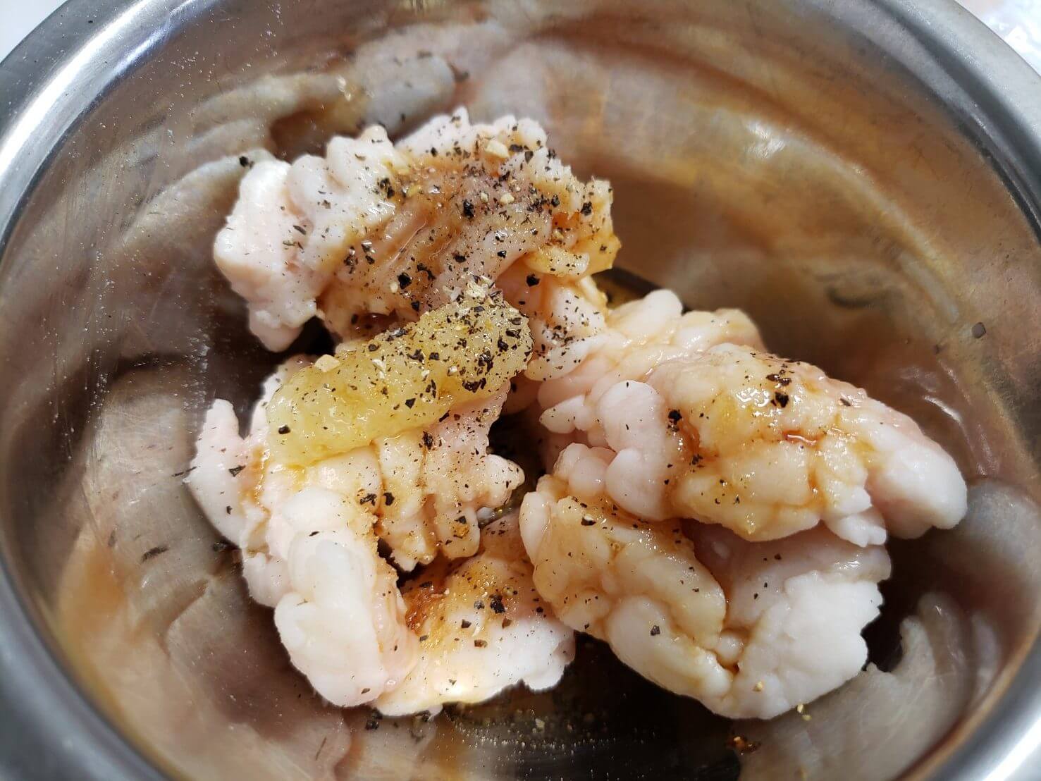 「塩、コショウ、ニンニク、味覇、旨味調味料、ごま油、酒」で味付けして、冷蔵庫で30分以上放置。