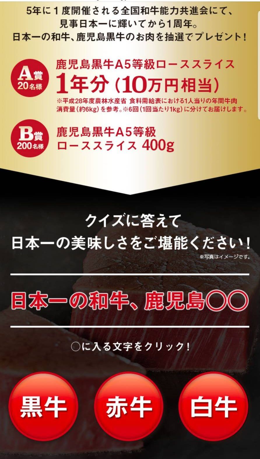 ↑のキャンペーンは終了していますが、鹿児島黒牛が獲得した団体総合優勝から1周年を記念して、日本一の和牛が最大で1年分届く