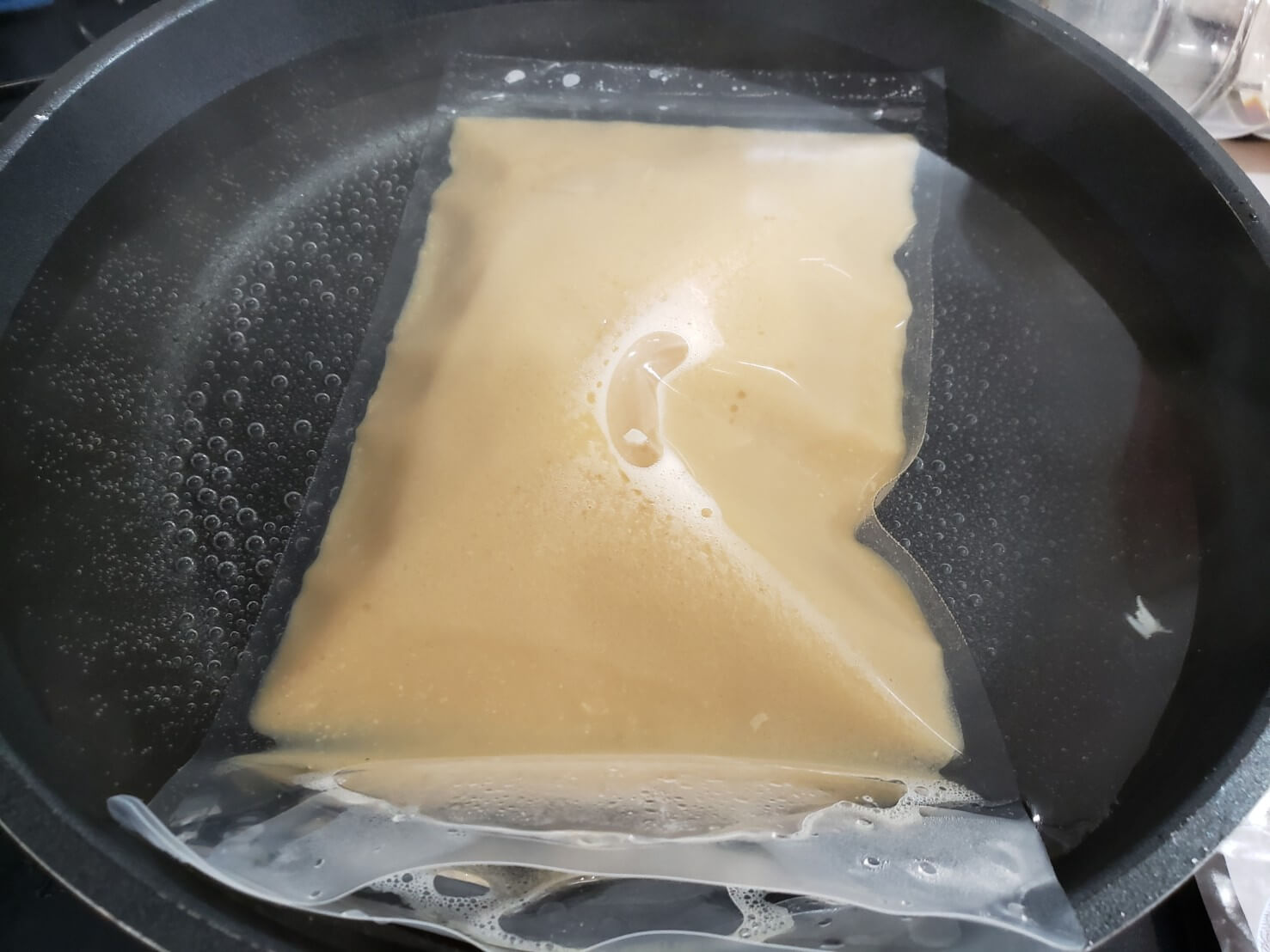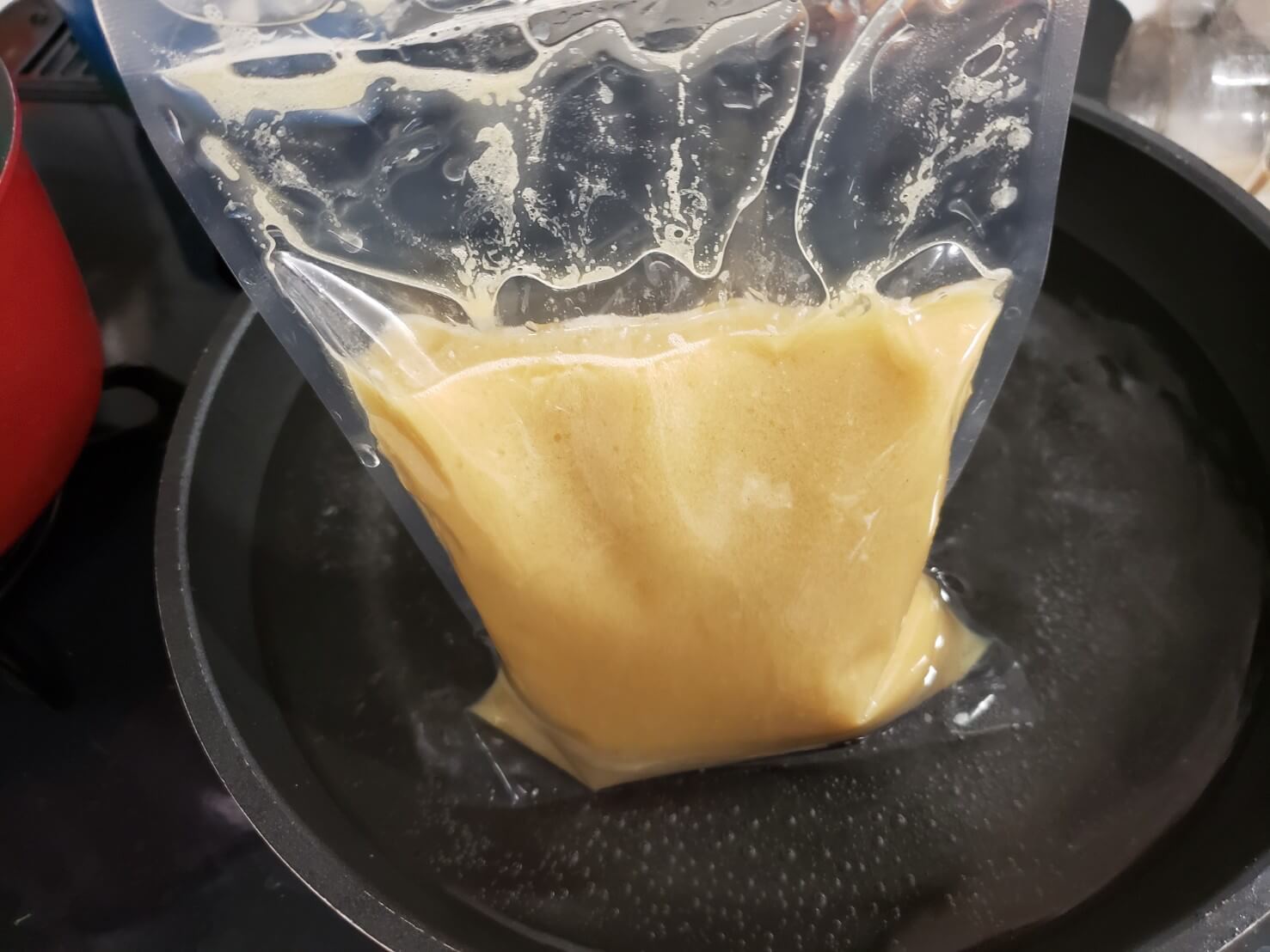 スープの封を切らずに、沸騰した鍋に入れて15分ほど沸騰させて温めます。