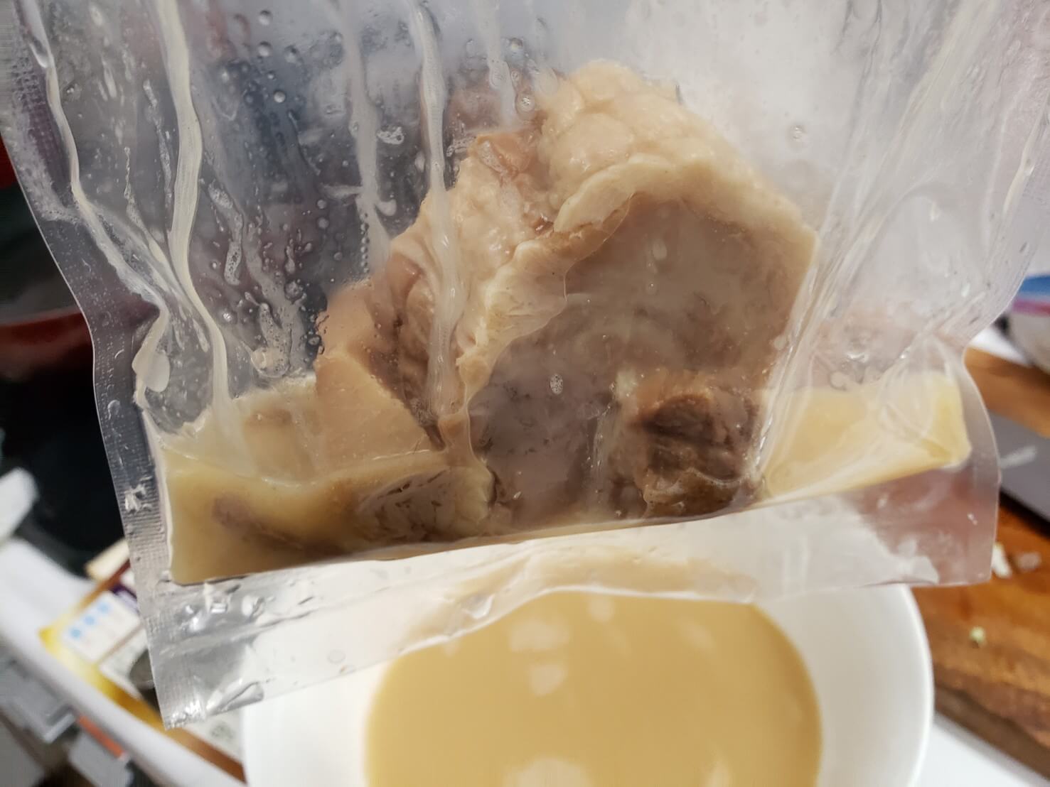 スープの袋に、豚が入っていますが、後からトッピングするのでこのままにしておきます。