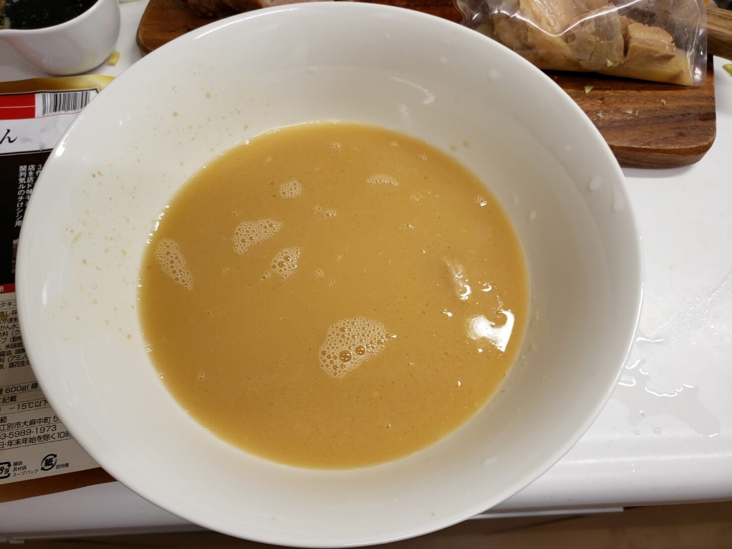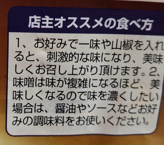 店主オススメの食べ方に「味噌は味が複雑になるほど、美味しくなるので味を濃くしたい場合は、醤油やソースなどをお好みの調味料をお使いください」と書いてあったので、煮豚を漬けといた醤油が余ってたので、醤油を大さじ二杯投入。