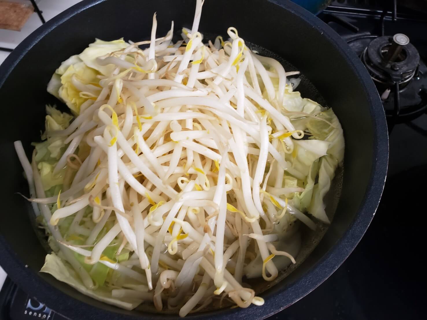 ブタキングのおすすめのトッピングは「茹でもやし(必須)、茹でキャベツ、刻みニンニク」がオススメと書いてあるので、スープと麺を茹でている間に茹でます。